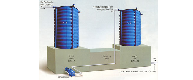 Major hurdle in reusing this excess condensate is the high temperature (85°C to 90°C). By using Aqua-Cool two stage cooling system it is cooled down to 32°C (+/-2°C).